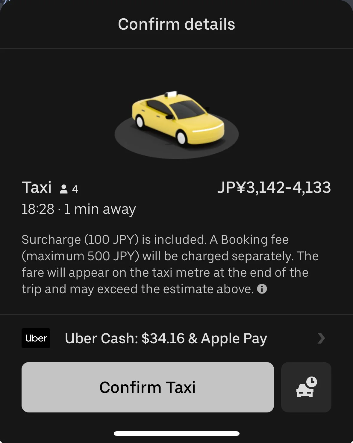 6) Uber or Go Taxi - I was not able to download the GO Taxi app and register before flying to Japan so I ended up using Uber to book a taxi. Your Uber account in Canada will also work in Japan so there’s no need to register for a new account. Although, using Uber in Japan costs more as there is a booking fee of maximum 500 yen per request and 100 yen surcharged included in every trip.